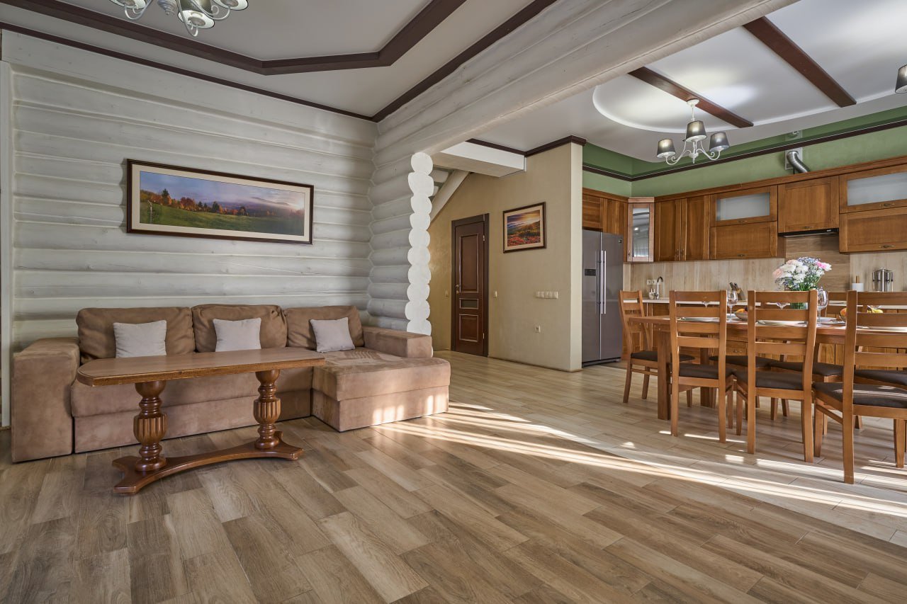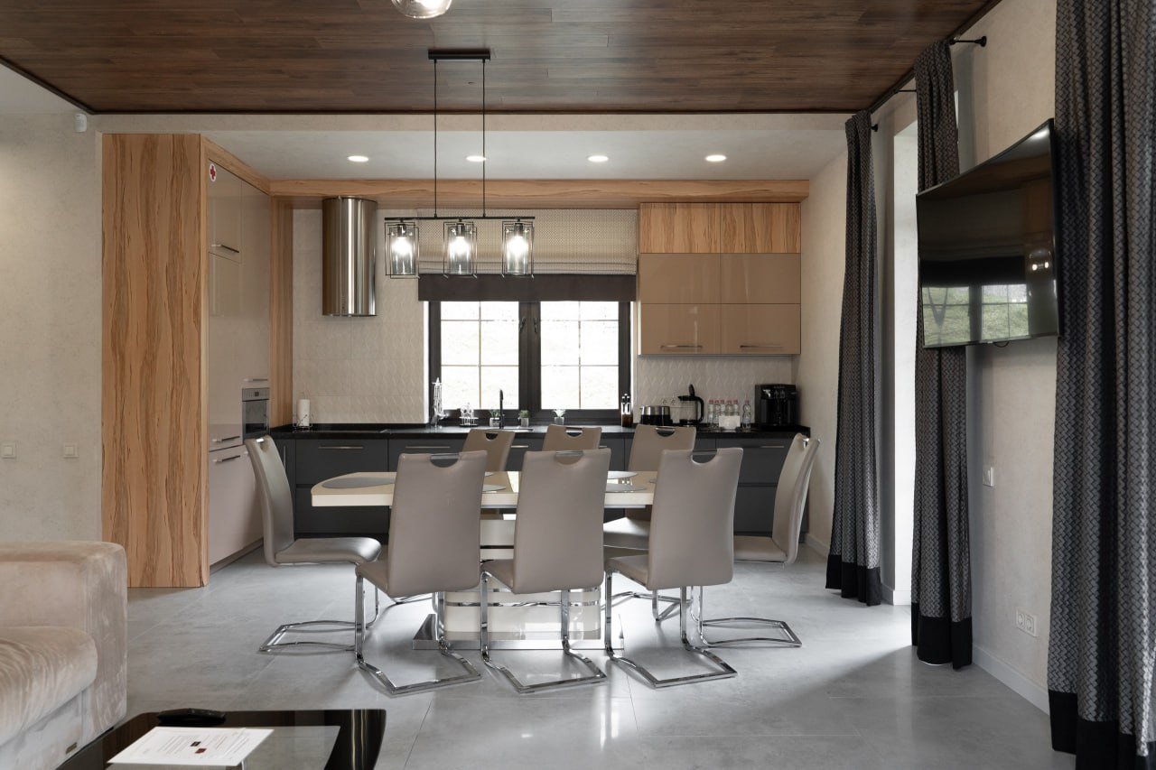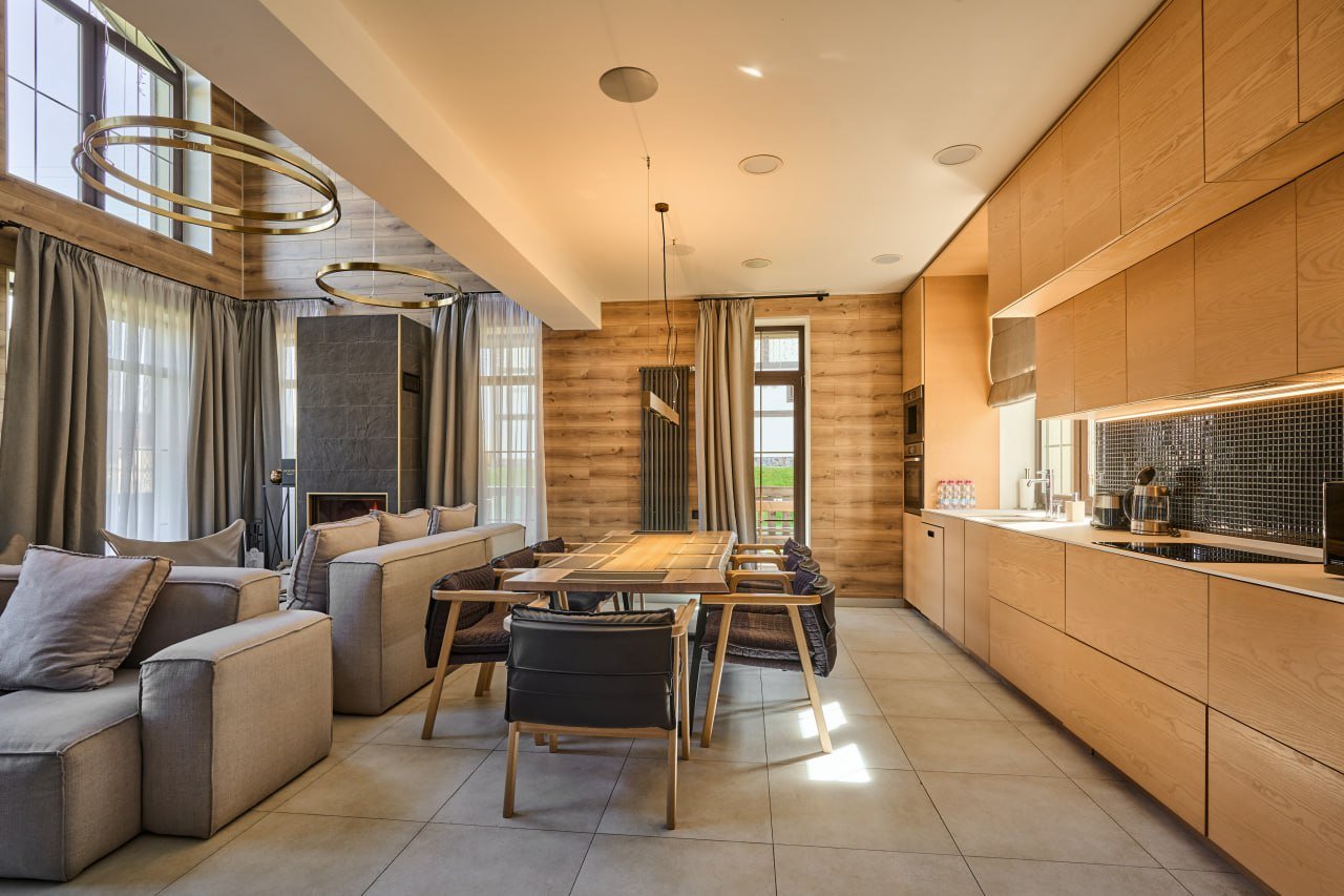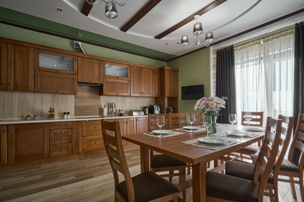 На першому поверсі розташована простора кухня, обладнана всією необхідною побутовою технікою та посудом. Зона відпочинку на цьому поверсі включає диван, телевізор та камін.