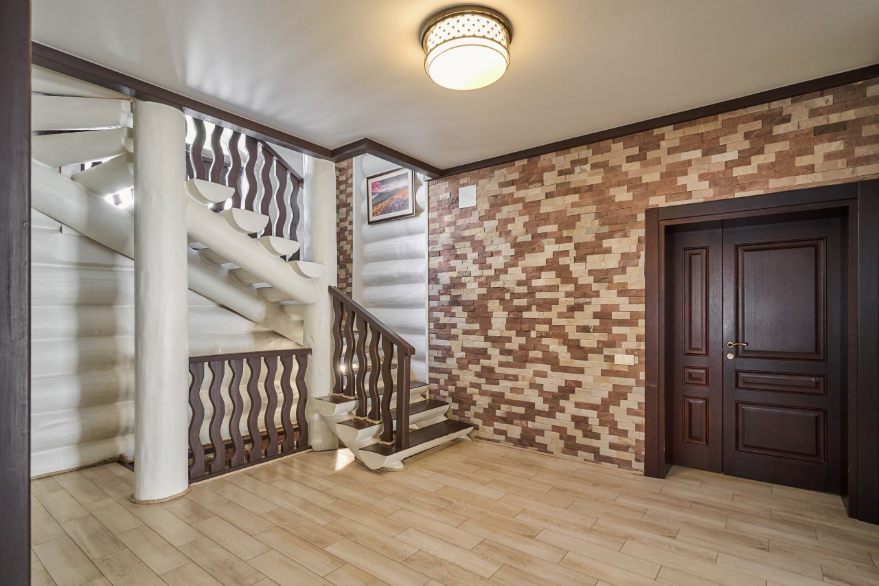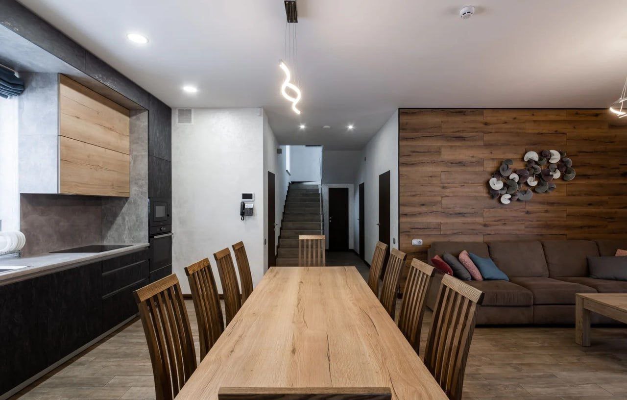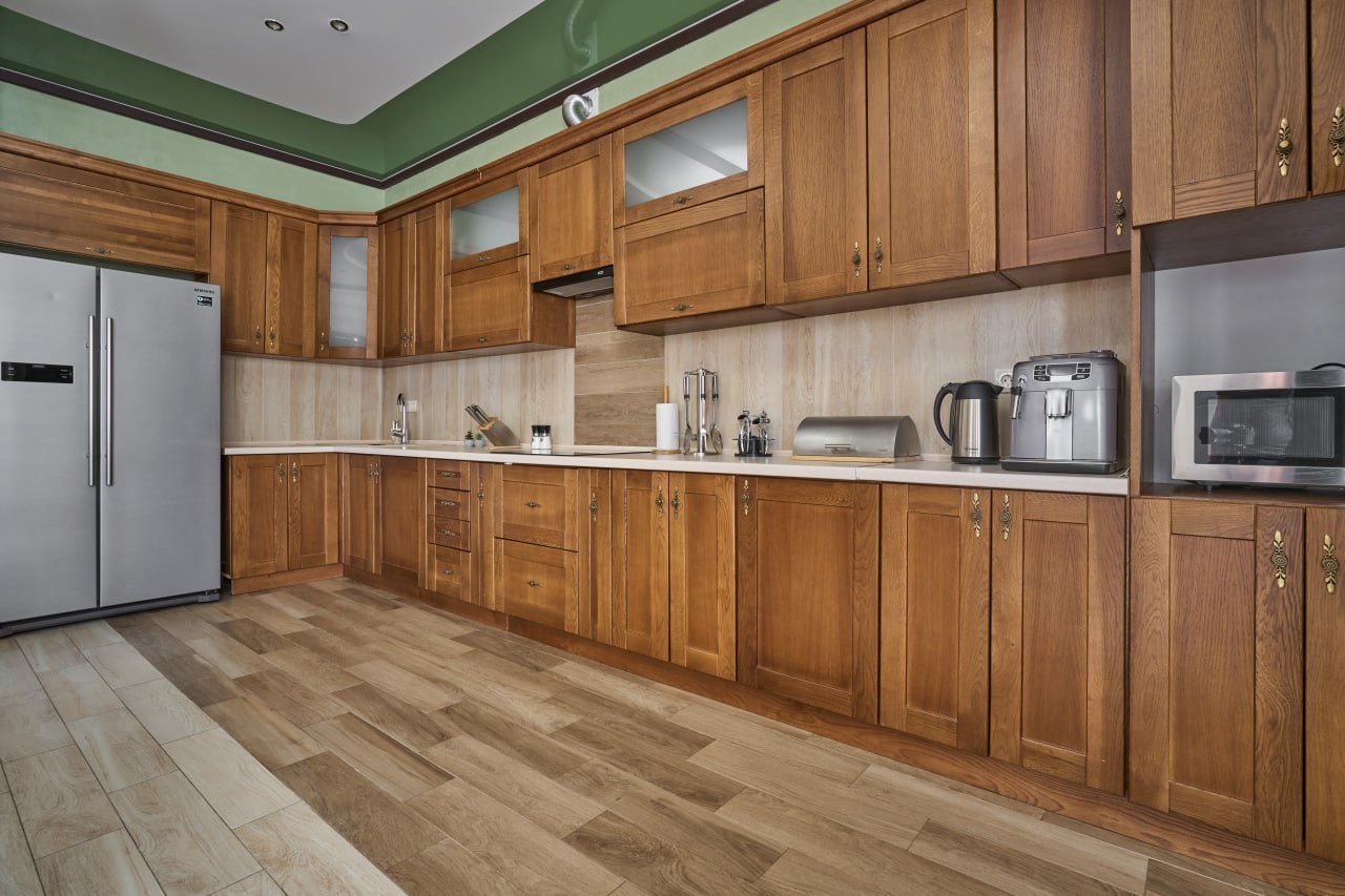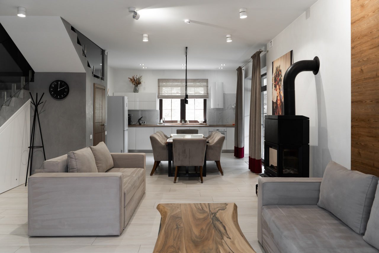 На першому поверсі розташована простора кухня, обладнана всією необхідною побутовою технікою та посудом. Зона відпочинку на цьому поверсі включає диван, телевізор та камін.
