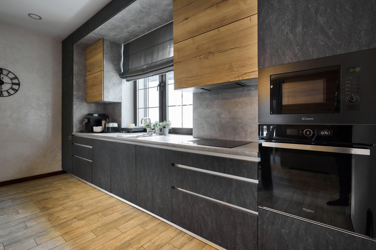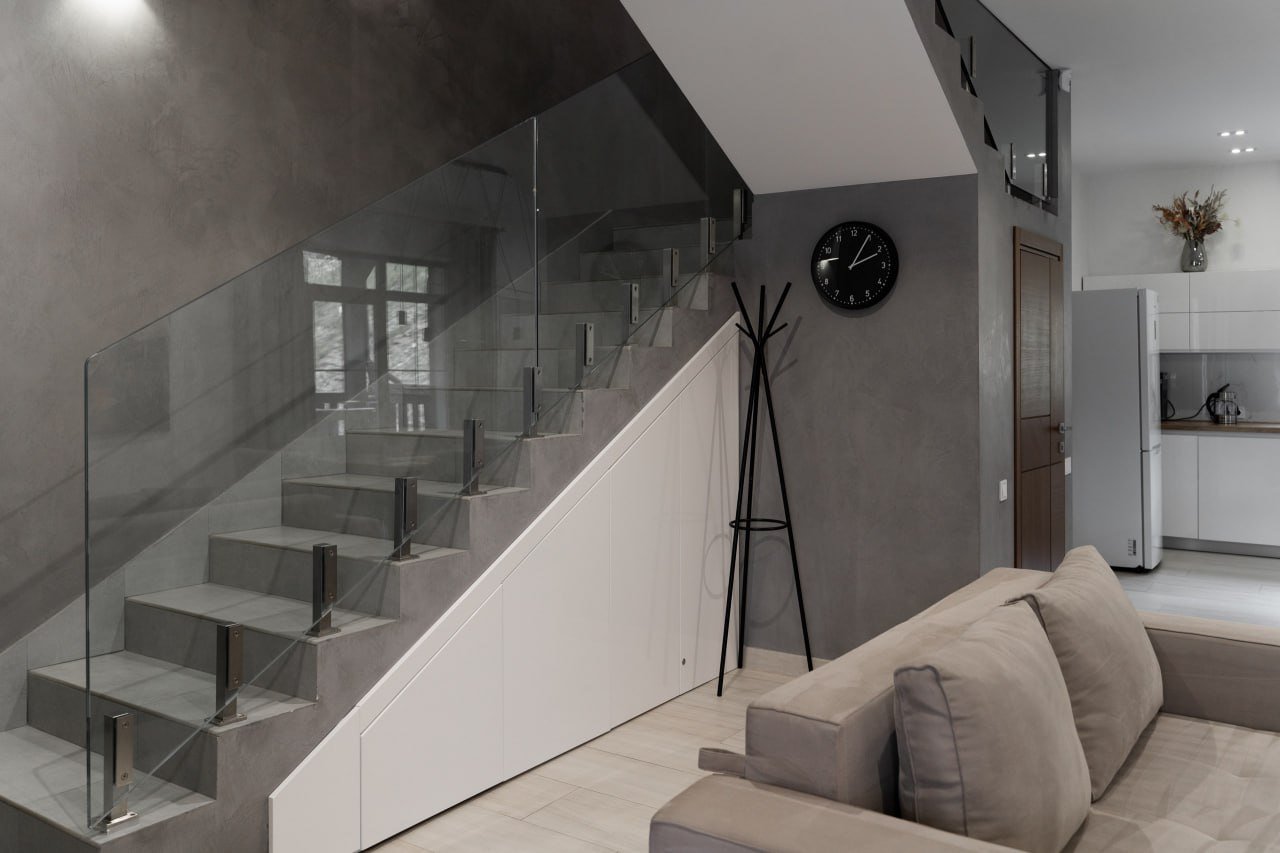 На першому поверсі розташована спальня, кухня-студія та обідня зона, вітальня з каміном та м’яким диваном, гостьовий туалет. З кухні є вихід на терасу з зоною барбекю та вуличними меблями.