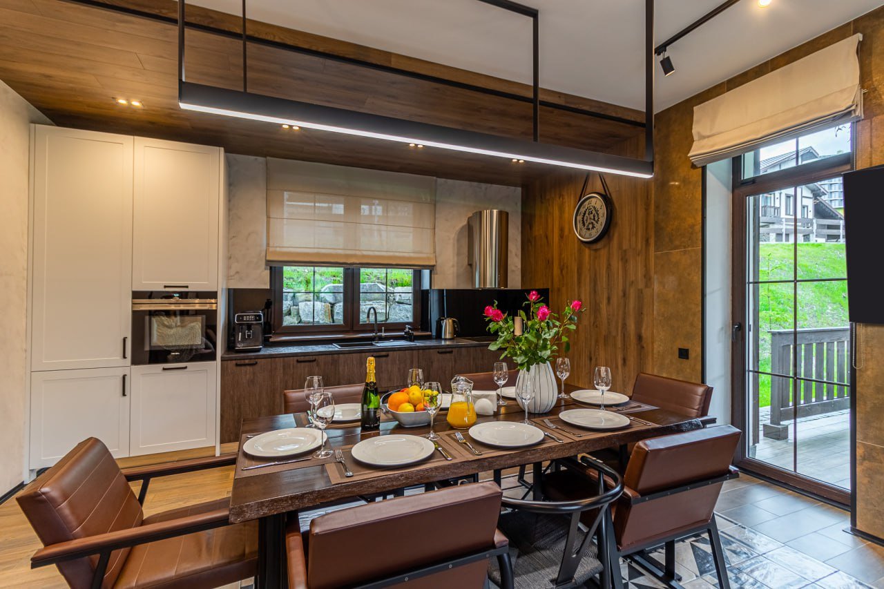 У Вашому розпорядженні власний просторий паркінг, професійна сушка для лижного спорядження, наявність окремої кімнати для няні, розташування на першій лінії котеджного містечка та швидкісний WI-FI на всій території котеджу.